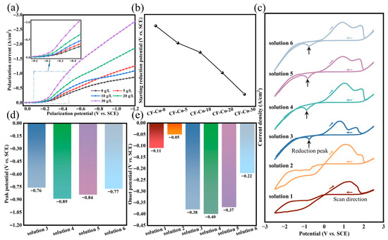 In the actual plating bath (Table 1), r-CFs functioned as the working electrode, with their immersion depth controlled at 1.5 cm. Cathodic polarization profiles were acquired via dynamic scanning at 10 mV s−1 over the potential window of −1.2 V to 0.5 V (vs. SCE) [31].