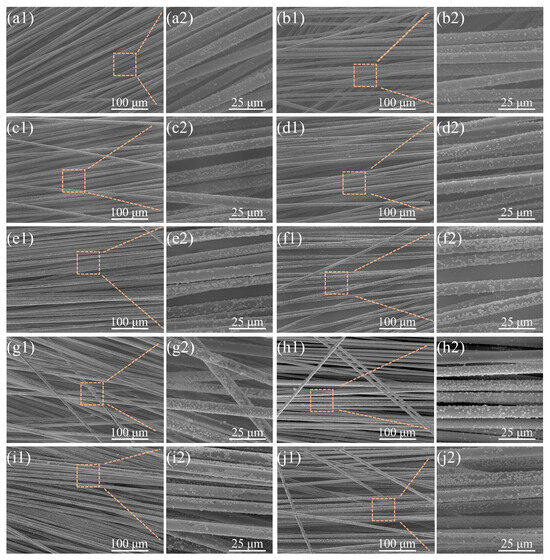 Copper loading on CFs with different concentrations of NaH2PO2 at electroplating times of 15 s (left) and 30 s (right): (a1–b2): 0 g/L; (c1–d2): 5 g/L; (e1–f2): 10 g/L; (g1–h2): 20 g/L; (i1–j2): 30 g/L.