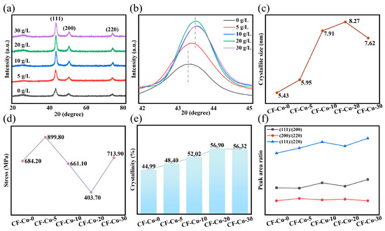 Properties of CF-Cu with different additions of NaH2PO2: (a) X-ray diffraction spectra; (b) high-resolution diffraction peak of Cu(111) crystal plane; (c) crystallite size; (d) internal stress of the coating; (e) change in crystallinity; (f) change in the area ratio of crystal diffraction peaks.