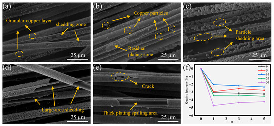 Morphologies of coatings on CF-Cu after 40 min ultrasonic damage treatment with different additions of NaH2PO2: (a) CF-Cu-0; (b) CF-Cu-5; (c) CF-Cu-10; (d) CF-Cu-20; (e) CF-Cu-30 and (f) Mass loss rate.