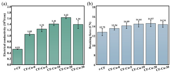 As demonstrated in Figure 9b, the copper coating produced a 6.20% increase in breaking force for CF-Cu-0 relative to r-CFs, a result ascribed to its mechanical reinforcement effect. CF-Cu-20 achieved the maximum breaking force of 14.57 cN, representing only a 7.61% increase compared to CF-Cu-0. This limited mechanical improvement originates from copper’s inherently inferior mechanical characteristics relative to CFs. While the mechanical performance of CF-Cu is predominantly dictated by the CF substrate, factors including coating–substrate adhesion, structural integrity, and coating quality still modulate the overall properties. Experimental findings reveal that although NaH2PO2 showed limited improvement in coating–substrate adhesion, its effectiveness in enhancing coating compactness and optimizing microstructure counterbalanced the detrimental effects of interfacial weakness, ultimately contributing to breaking force improvement. When the concentration of NaH2PO2 is excessively high, the degradation of the coating quality diminishes its reinforcing effect, and the breaking force decreases accordingly.