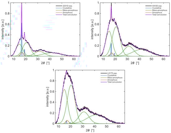 Diffractograms of the three grades of PLA are shown in Figure 1. The experimental diffraction patterns, after background baseline removal, were analyzed with a custom script in MATLAB. The eventual presence of instrumental peak broadening was not corrected with an additional dedicated procedure. Deconvolution of the peaks was carried out by fitting a series of Gaussian distributions, with center values and FWHM (Full Width at Half Maximum) values obtained from literature [40,41,42,43,44,45] as initial guess values.