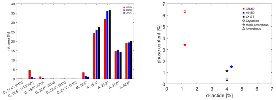 The peaks found with curve fitting were assigned to the different crystalline reflection planes or to meso-amorphous or amorphous halos. Peaks relevant to the (010), (110/200), (203), (210), (213) and (116) crystallographic planes were found at values of 2 in the immediate vicinity of 14.8°, 16.5°, 19°, 22°, 23.5° and 24.5°, respectively. These peaks belong to well-ordered structures, as suggested by their low values of FWHM (~0.5°), in agreement with [43]. Broader peaks with FWHM close to 8°, relevant to the amorphous phase, were found at angles close to 15°, 21°, 31° and 42° [42,43]. Finally, a peak centered around 2 = 16.5° with an intermediate FWHM (~3°) suggests the presence of an intermediate phase, referred to as meso-amorphous [41,42]. Once the peaks were isolated and properly assigned to the different phases, it was possible to determine their relative intensity as the area underneath the curves (Figure 2 (left)) and then the amount of the different phases inside the polymers was evaluated. Figure 2 (right) shows the amount of crystalline and meso-amorphous phases (amorphous phase was left out for scale purposes) as a function of the d-lactide content. Although it is difficult to establish a trend, since 4043D and LX175 show very similar values, it is possible to infer that a higher content of d-lactide determines an almost completely amorphous micro-structure.