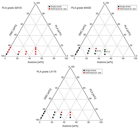 Figure 3 shows the ternary plots for the different solutions prepared with the three grades of PLA under investigation. It can be observed that with PLA 3251D, it was never possible to achieve stability of the solutions, apart from those with a low concentration of polymer and low amounts of acetone. On the contrary, PLA 4043D and LX175 showed a wide region of solubility and only in a few cases, at higher PLA concentrations and acetone fractions, phase separation occurred. This result, in combination with data from Figure 2 (right) suggests a direct correlation between the solubility of PLA and the amount of amorphous domains and/or d-lactide content found by XRD analysis (Section 3.1). This result is in agreement with the findings of [47].