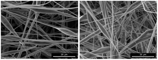 An example of the fibers obtained without defects after spinning is shown in Figure 5. By observing the fibers at high magnification, it is possible to observe that the surface is not smooth; rather, it reveals the presence of nanometric pores distributed along the surface of the fibers. This nanoporosity is observed consistently across multiple samples and does not depend on the specific spinning parameters, indicating that it is likely governed by solvent dynamics rather than flow instability. The rapid evaporation of acetone during jet elongation, in contrast with the slower evaporation rate of dimethyl carbonate, can create a concentration gradient at the fiber surface. This condition may promote localized phase separation or incomplete solvent removal, resulting in the formation of nanopores upon solidification. Similar surface features have been reported in electrospun systems where phase separation is driven by differential solvent volatility [48]. It has been reported that polymer stereochemistry and the associated amorphous content play a key role in fiber formation during electrospinning, as variations in DL-lactide content can influence jet stability, fiber diameter, surface porosity, and defect formation in poly(lactide) copolymers [49]. From an application standpoint, this nanoscale surface porosity represents a beneficial feature for biomedical scaffolds, as it increases the specific surface area available for cell–material interactions and protein adsorption, while facilitating permeability and mass transport across the fibrous mat, which are critical aspects in tissue engineering [50,51]. Notably, this nanoporosity is intrinsically generated by the selected DMC/acetone solvent system, without requiring additional post-processing steps.