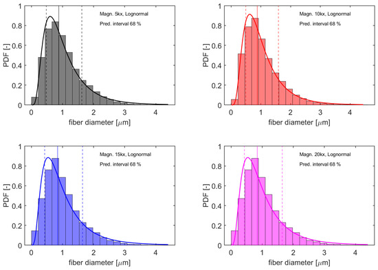 Diameter distributions obtained from subsets of images obtained at different magnifications (black = 5k×, red = 10k×, blue = 15k× and magenta = 20k×) from fibers spun at 0.5 mL/h and 20 kV from a solution with 9/45.5/45.5 PLA/DMC/AC wt% (Test ID 2). Solid lines represent a fit with Log-normal distribution and vertical solid and dashed lines indicate median values and the prediction intervals containing 68% of the observations, respectively.