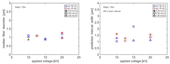 Median fiber diameters (left) and widths of prediction intervals containing 68% of the observations (right) as a function of applied voltage. Blue and red markers represent solutions 14 and 28, respectively (refer to Table 2 for details on composition). Stars, circles and triangles represent tests performed with a flow rate of 0.25, 0.5 and 1 mL/h, respectively.