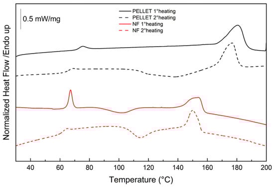 DSC thermograms of PLA pellets and PLA nanofibers (NF) during the first and second heating.