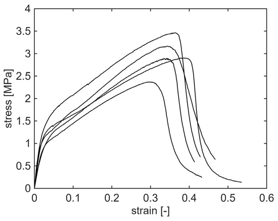 Stress–strain curves of the tensile tests performed on selected spun mat, corrected to consider the actual solid cross-section. Five specimens, cut from the same electrospun mat, were tested.