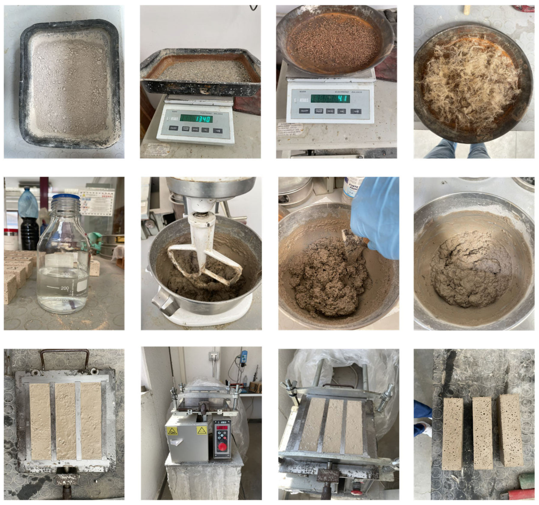 The design and preparation of the mixtures used for specimen casting were carried out in accordance with the European Standards UNI EN 1015-2 [13]. Building upon the findings of previous studies and considering the new sustainability and workability requirements introduced in this research, the final mix formulations for the thermal fiber-reinforced plaster were defined as reported in Table 1 and the process of matrix as shown in Figure 2.