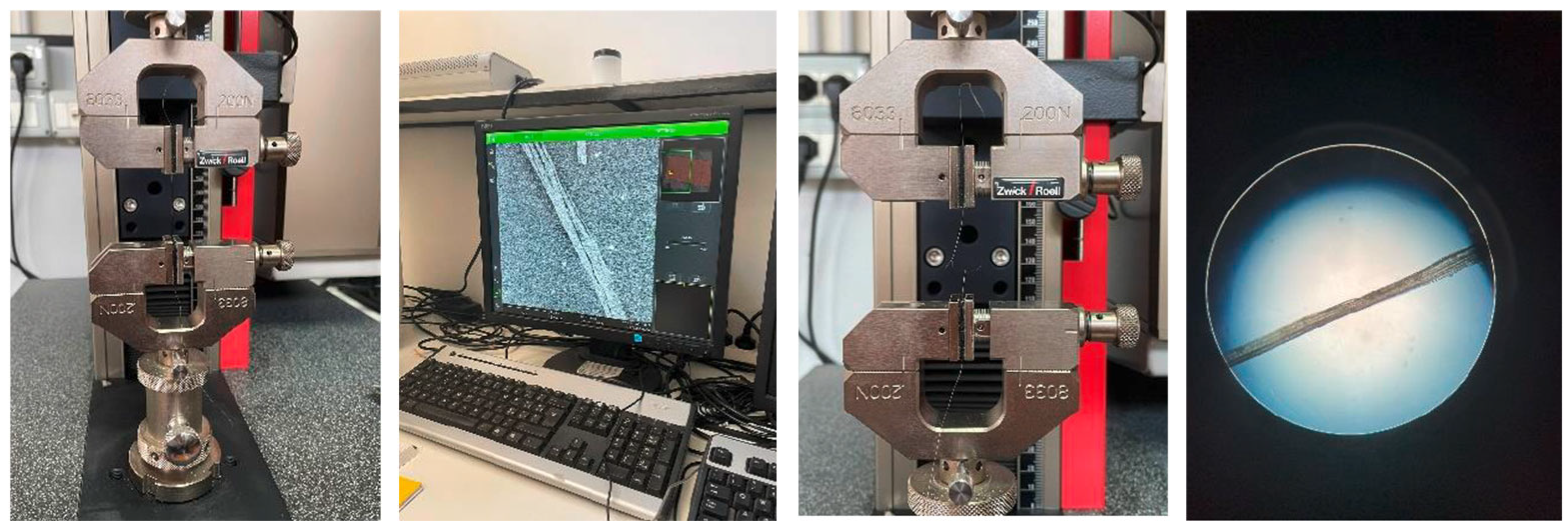 From each bundle, five individual filaments were manually extracted using precision tweezers, avoiding surface defects or mechanical damage that could alter the tensile response. Prior to testing, all specimens were conditioned under controlled laboratory conditions (20 ± 2 °C; RH 50 ± 5%) for 24 h, following the environmental pre-conditioning protocols commonly adopted for bio-based fiber materials. Uniaxial tensile tests were performed using a Zwick/Roell Z020 universal testing machine.