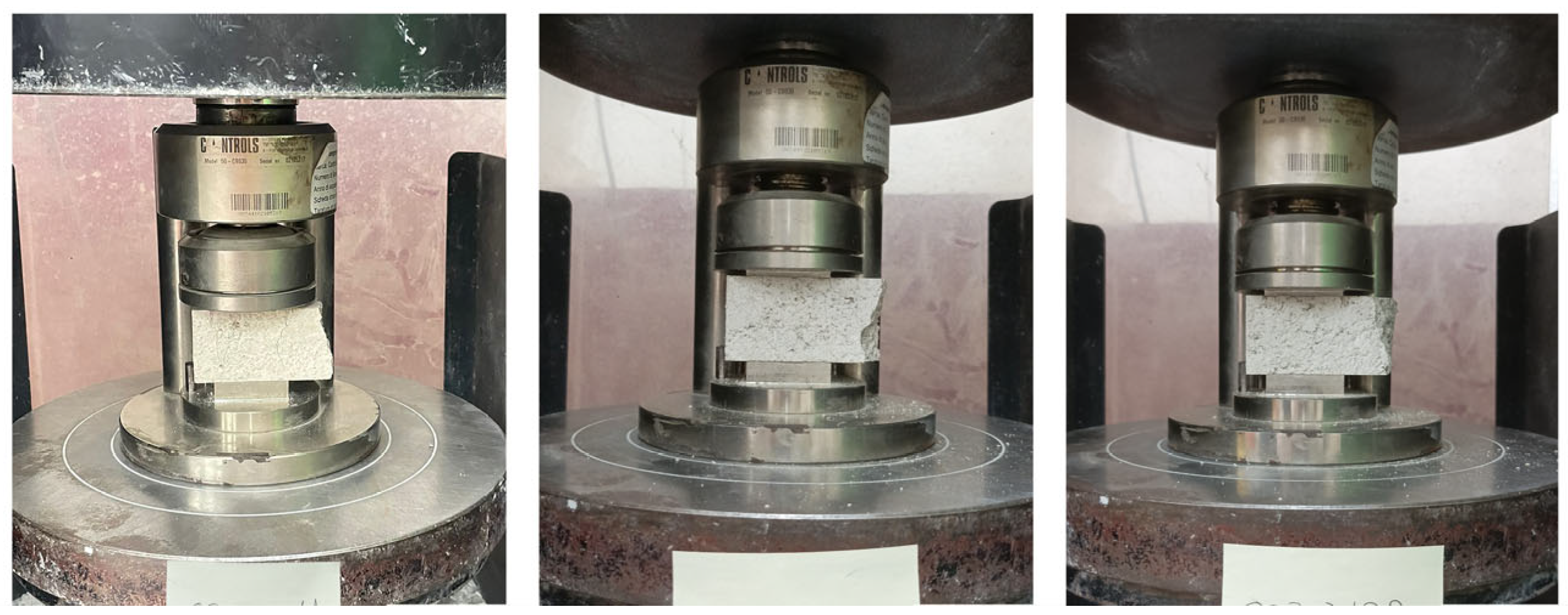Specimens were carefully positioned on a Matest universal testing machine (see Figure 7), ensuring correct alignment between the loading platens and the sample to prevent eccentric loading or premature instability. A progressively increasing load was applied via a hydraulic actuator until specimen failure, and the maximum load at fracture was recorded for each sample.