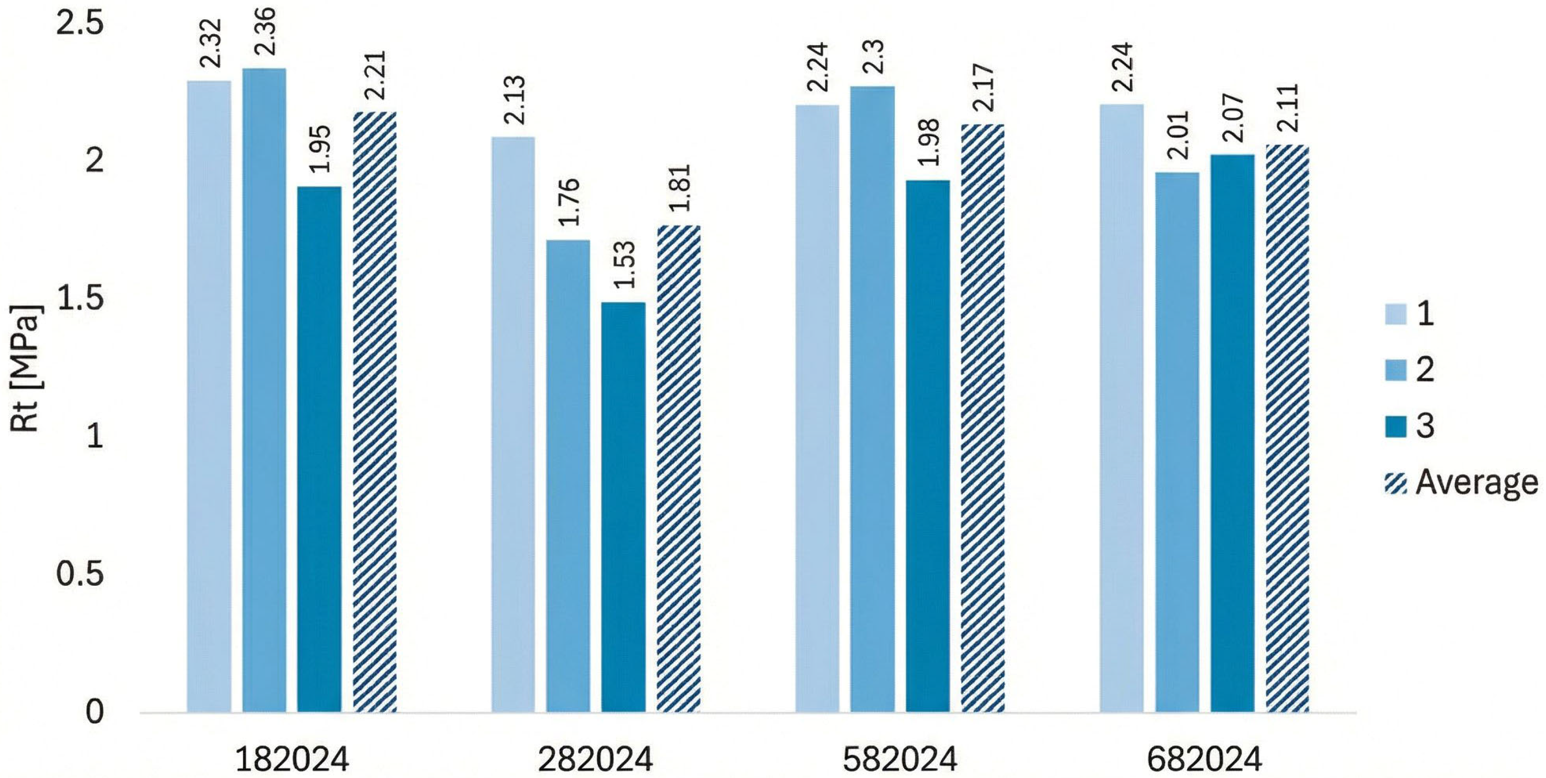 Matrix 182024 exhibits the highest average value, equal to 17.53 MPa, followed by the reference matrix 682024 with a comparable value. Matrices 282024 and 582024, both containing cork and broom fiber, show slightly lower compressive strengths (15.81 MPa and 15.85 MPa, respectively). Although these values are marginally lower than those of fiber-free matrices, their behavior under load indicates an enhanced ability to accommodate variable and cyclic stresses.
