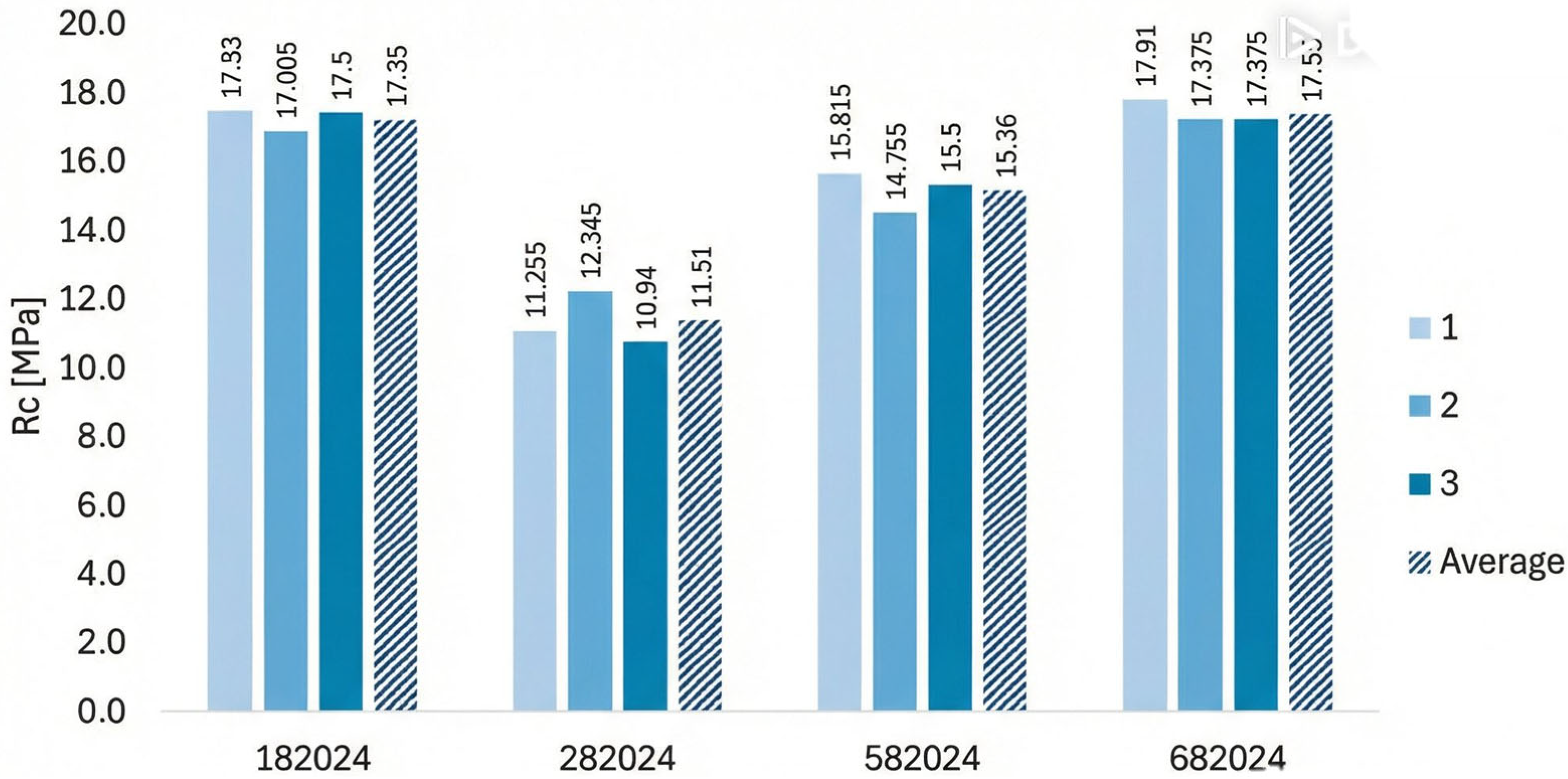 The 182024 matrix, containing 30% cork, showed a slight reduction in compressive strength (16.38–17.94 MPa, mean 17.34 MPa) while maintaining uniform behavior among specimens. The cork reduced density without significantly compromising compressive performance, confirming its suitability for applications requiring a lightweight mortar with structural capability.