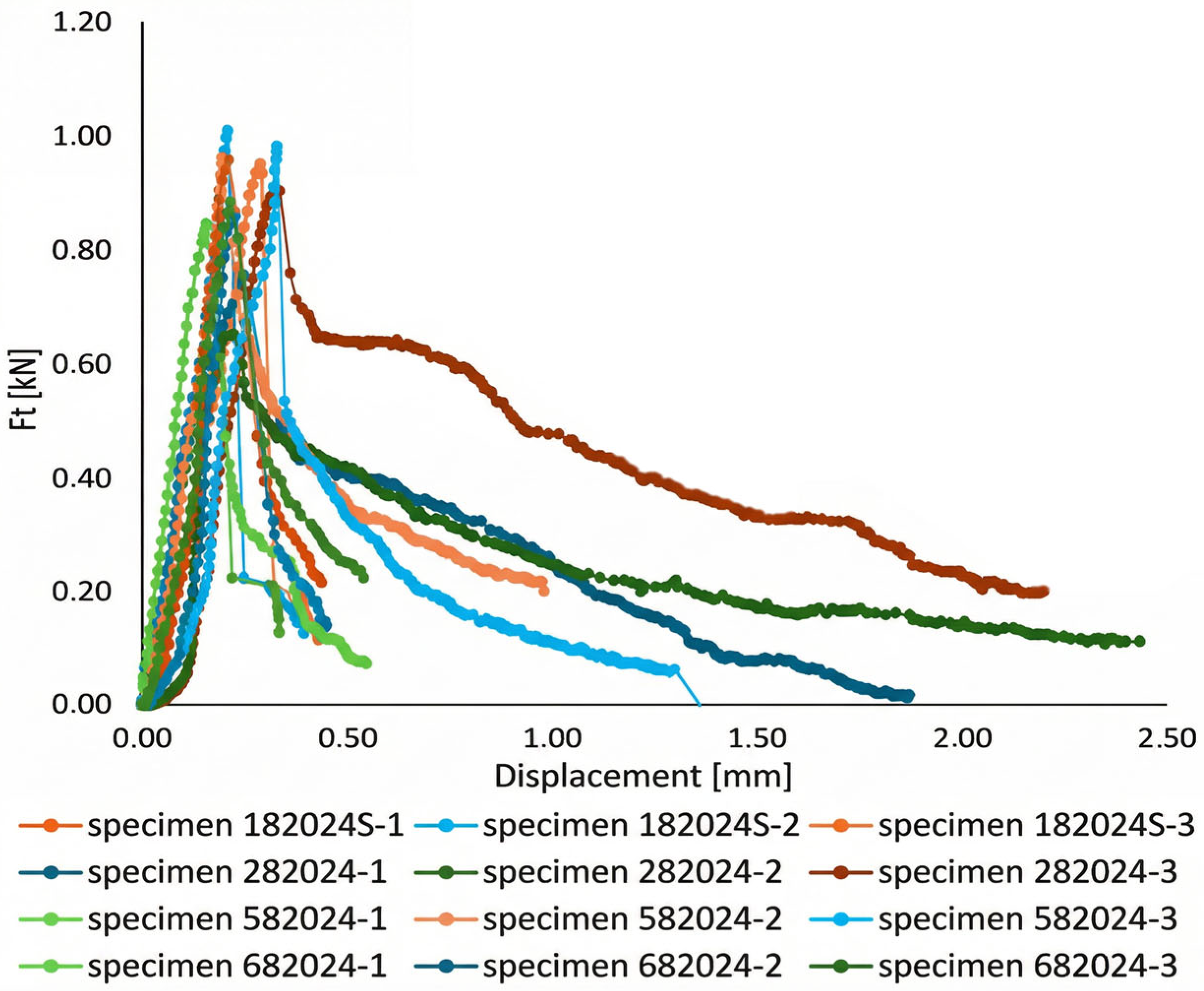The flexural tests were performed under displacement control, continuing until the specimens failed. For each specimen, the recorded load and deflection values were tabulated.