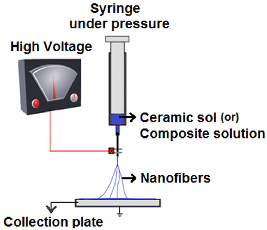 With two types of electrospinning, namely melt spinning and wet spinning, being practiced, the latter is the most commonly used. In melt spinning, the material is melted by applying external heat to form a melt to spin, whereas in wet spinning, the component is dissolved in a suitable solvent to form a spinnable solution, which is then subjected to high electrostatic voltage [13,14]. As ceramics have a high melting point, they are mostly electrospun by the wet method as a sol-gel or composites with a polymer in the form of solution [3]. A typical wet electrospinning setup is shown in Figure 1. In general, ceramic nanofibres are produced by electrospinning ceramic precursors or nanoparticles along with polymer followed by calcination at higher temperatures to remove polymer residues. However, there are also reports on the fabrication of ceramic nanofibres from ceramic sols in the absence of polymers [15,16,17].