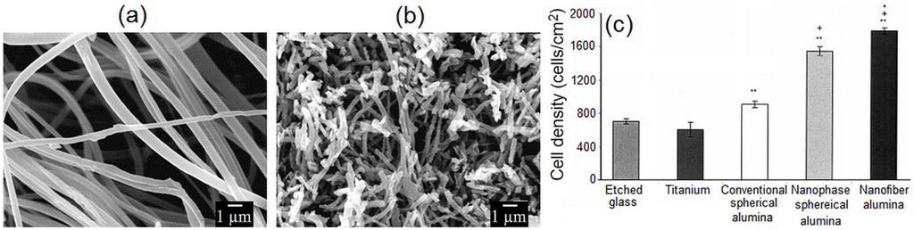 SEM images of (a) as-spun aluminium acetate/polyvinylpyrrolidone (PVP) fibres; (b) electrospun fibres after 1200 °C annealing [22] (reproduced with permission from Elsevier, Copyright 2006); and (c) osteoblast cell density under standard cell culture conditions determined on various alumina substrates. All data shown are the mean ± SEM (= 3). *p < 0.05 compared with all other material formulations; +p < 0.05 compared with conventional spherical alumina; **p < 0.05 compared with either reference material (glass and titanium) [26] (reproduced with permission from Wiley, Copyright 2003).