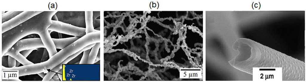 SEM images of (a) electrospun PVA/ZrO2-H nanohybrid mats (inset: energy-dispersive X-ray spectrum) [23] (reproduced with permission from Elsevier, Copyright 2008); (b) ZrN fibres after heating treatment at 1600 °C [31] (reproduced with permission from Elsevier, Copyright 2008); and (c) 8YSZ hollow fibres calcined at 1000 °C [34] (reproduced with permission from Elsevier, Copyright 2008).