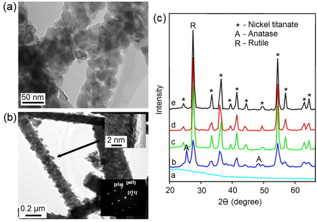 TEM image of (a) TiO2 nanofibres [41] (reproduced with permission from Elsevier, Copyright 2005); and (b) BaTiO3 nanofibres (upper inset: high resolution image showing lattice fringes; lower inset: convergent beam electron diffraction pattern) [43] (reproduced with permission from Elsevier, Copyright 2005); (c) XRD patterns of NiTiO3 fibres (label code a: as-prepared composite fibres; b: fibres calcined at 873 K; c: fibres calcined at 1073 K; d fibres calcined at 1173 K; and e fibres calcined at 1273 K) [49] (reproduced with permission from Elsevier, Copyright 2004).