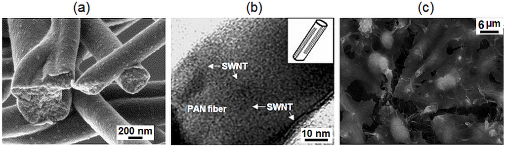 (a) SEM image of the fracture (during bath ultrasonication) surface of carbonized polyacrylonitrile (PAN) fibres [59] (reproduced with permission from Elsevier, Copyright 2005); (b) TEM image of nanocomposite fibrils showing a uniform distribution, no agglomeration and excellent SWNT alignment in a PAN fibre with a diameter of about 50 nm [62] (reproduced with permission from Wiley, Copyright 2003); (c) SEM image of L929 mouse fibroblasts growing on an MWCNT-based network after seven days [63] (reproduced with permission from American Chemical Society, Copyright 2004).