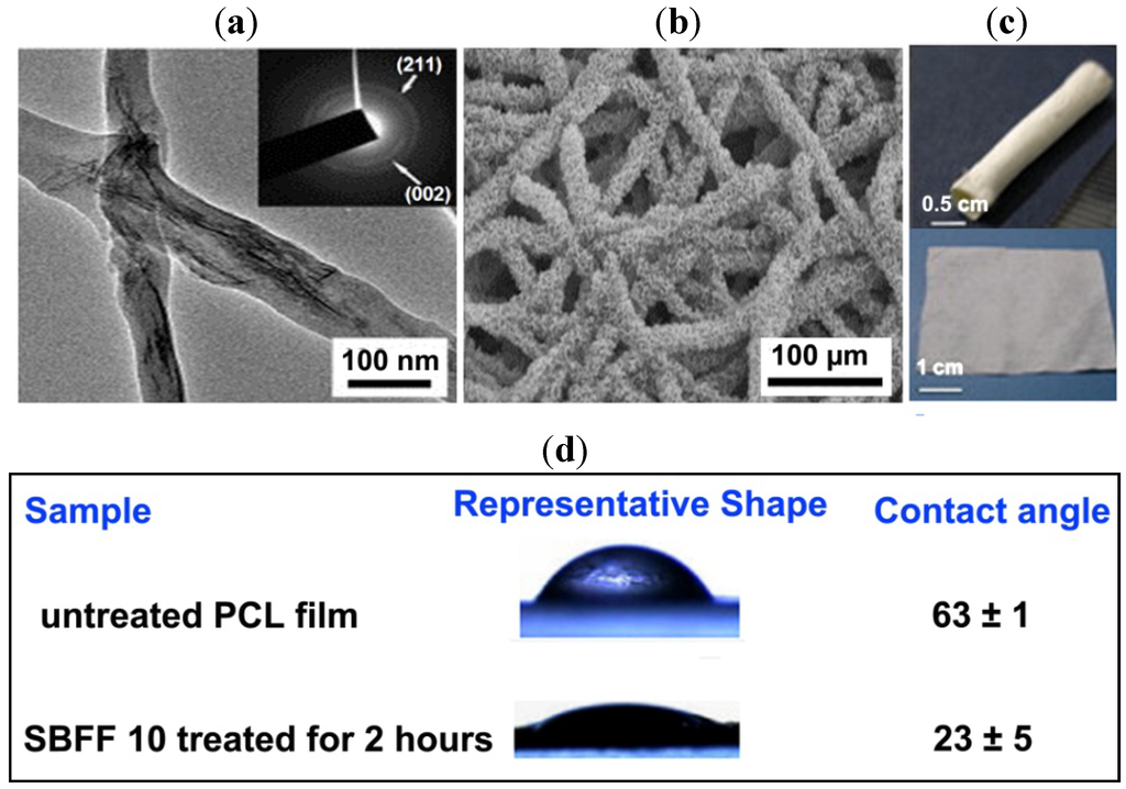 (a) TEM image of the collagen-30 wt% HAp composite fibres at high magnifications. The inset shows the selected area diffraction (SAD) pattern of the fibres [77] (reproduced with permission from Elsevier, Copyright 2008); (b) SEM micrograph showing the surface of the electrospun polycaprolactone (PCL) scaffolds after coating with simulated body fluid (SBF; 10×) for 2 h; and (c) contact angle measurements on a pristine electrospun PCL mat and electrospun PCL scaffolds after coating with SBF10 for 2 h [81] (reproduced with permission from Elsevier, Copyright 2008); (d) single-phase hydroxyapatite (HAp) fabrics (film and tube) prepared by calcination of HAp/PVP composite nanofibres as the precursor [82] (reproduced with permission from Elsevier, Copyright 2010).