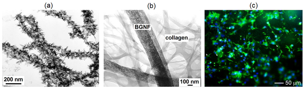 (a) TEM images of bioactive glass nanofibre after incubation in a simulated body fluid for three days [89] (reproduced with permission from Wiley, Copyright 2006); (b) TEM image of the bioactive glass nanofibre (BGNF)-Col nanocomposite, showing the mesoporous BGNF nanofibres (300–400 nm in diameter) organized with collagen self-assembled nano-fibrils (less than 100 nm in diameter) [90] (reproduced with permission from Wiley, Copyright 2006); and (c) fluorescence microscopy images showing the osteoblast precursor cell (MC3T3-E1) morphology after culturing for three days on electrospun bioactive glass fibres [96] (reproduced with permission from Elsevier, Copyright 2012).