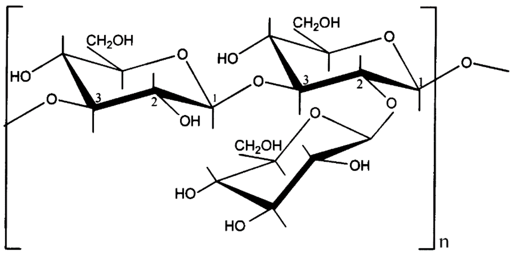 (1→3)-β-d-Glucan is produced by a lactic acid bacterium, Lactobacillus suebicus CUPV221 [15]. This biopolymer is a main linear chain of (1→3)-β-d-Glucopyranosyl units, with one (1→2)-β-d-Glucopyranosyl pendant unit attached to every two units of the main chain, as shown in Figure 1 [16].