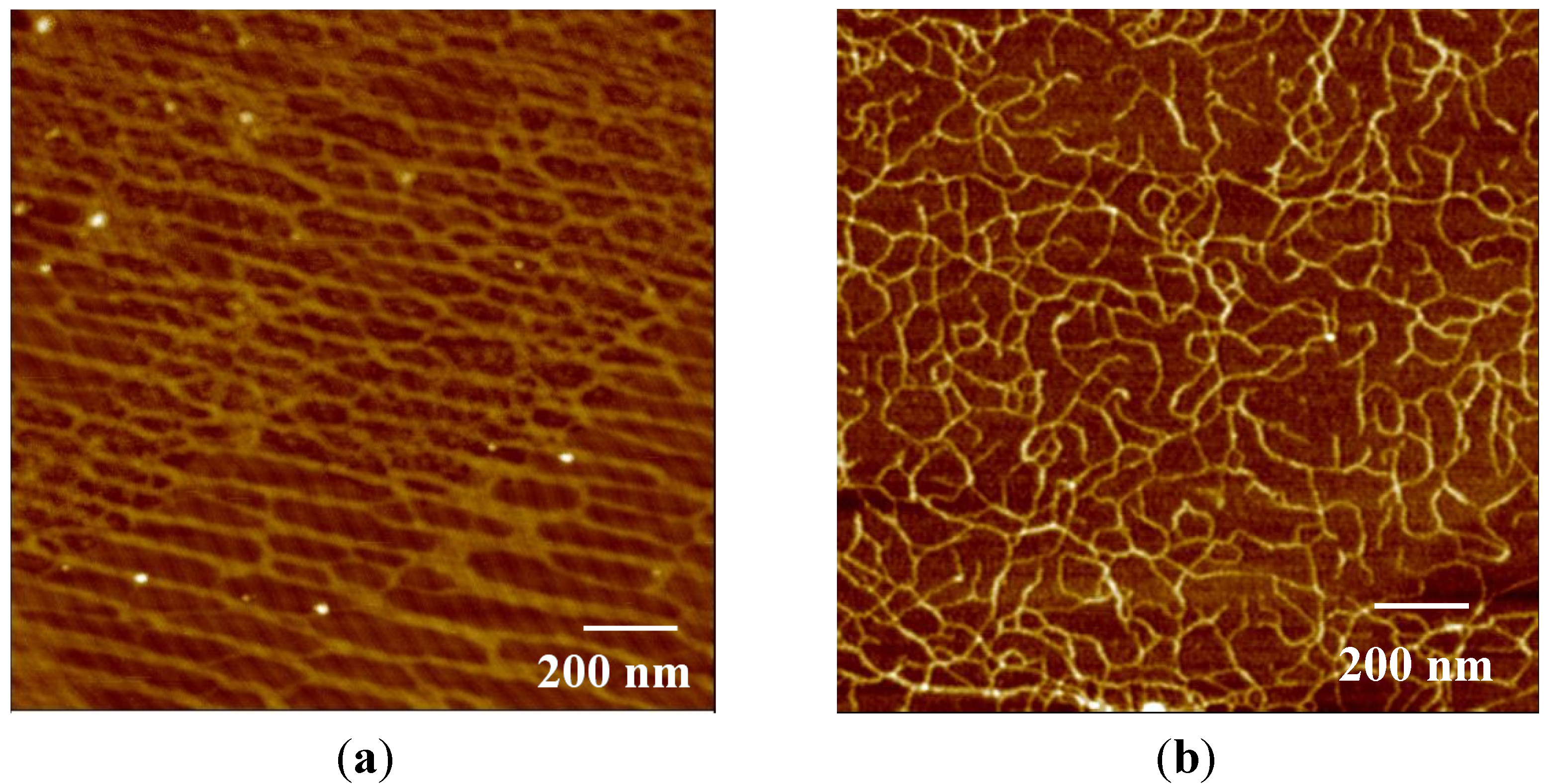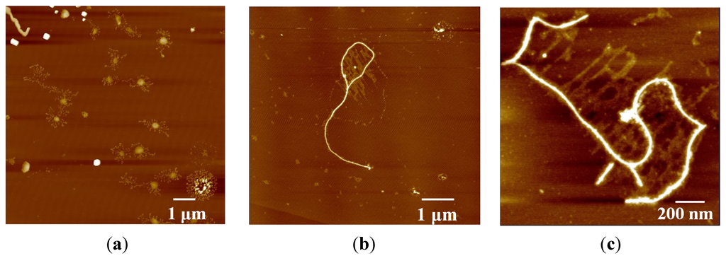 - McIntire, T.M.; Brant, D.A. Imaging of individual biopolymers and supramolecular assemblies using noncontact atomic force microscopy. Biopolymers 1997, 42, 133–146. [Google Scholar] [CrossRef] [PubMed]