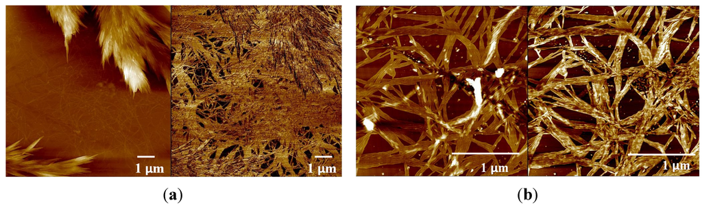 In its solid-state, commercial curdlan is insoluble in water at room temperature. Therefore, to carry out the study by AFM it was necessary to prepare a solution with a suitable solvent. Due to the ionization of hydrogen bonds, curdlan dissolves easily in dilute alkalinesolutions. When this solvent is used to carry out morphological and structural studies, curdlan shows different morphologies depending on pH, ranging from endless microfibrils to spindle-shaped fibrils of various lengths [23], or even thin lamellar hexagonal crystals [24], and the conformation varies from triple or single helix to random coil [25]. When a weak alkaline solution is used to prepare the AFM samples, the curdlan structure could almost be maintained [8]. Thus, 5 mM NaOH aqueous solution, pH 11.75, was chosen to develop the present study. Figure 3 shows the morphology of curdlan after the evaporation of the solvent at room temperature. A height image (left) reveals a fairly rough morphology with a high density of spike-like growth features. Observing the phase image (right), a homogenous color of the image is seen. This means that more curdlan exists between the spindle-shaped joined microfibrils forming the spike-like features. When a higher magnification of this area was made, 2.5 µm × 2.5 µm scan, an entanglement of fibrils composed of laterally associated strands were observed (Figure 3b).