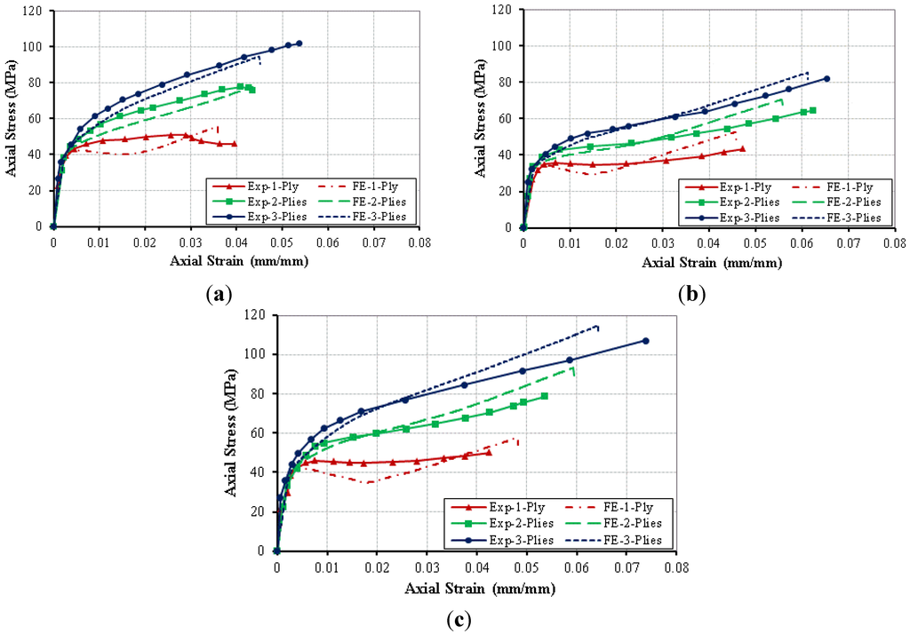 FE results versus experimental results by Dai et al. [13] of the CFFT with: (a) PEN-FRP-600; (b) PET-FRP-600; and (c) PET-FRP-900.