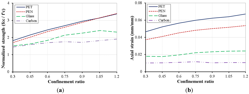 Figure 5 illustrates the relation between the confinement ratio and the normalized strength and between the confinement ratio and the ultimate axial strain for all of the FRP composites. This figure illustrates the efficiency of the different types of FRP in normalized strength and ultimate axial strain at the same confinement ratio. It is very clear in the figure that the CFFTs with LRS-FRP were more efficient than those with traditional FRP. This clearly indicated the great effect high rupture strain had on the confinement.