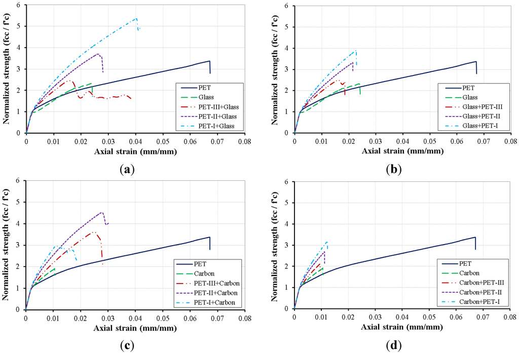 Figure 6 illustrates the axial strain-normalized strength for the CFFTs with traditional FRP, LRS-FRP, and hybrid FRP with the same confinement ratio of 1.2. Fiber stacking sequences were investigated by placing PET-FRP in the inner surface of the FRP tube and placing glass or carbon FRPs in the outer surface and vice versa. Figure 6a illustrates the PET, glass, and hybrid PET/glass where the PET was in the inner surface. In general, placing the LRS-FRP in the inner surface and the traditional FRP in the outer surface revealed a better performance than placing the traditional FRP in the inner surface. The reason for this behavior was that the rupture strain of the traditional FRP is much lower than that of the LRS-FRP. Therefore, the traditional FRP ruptured earlier than the LRS-FRP. Hence, when the traditional FRP was placed in the inner surface, the LRS-FRP was controlled by the traditional FRP rupture strain, and it ruptured directly after the rupture of the traditional FRP. However, when the traditional FRP was placed in the outer surface, the LRS-FRP was controlled by it, and it continued until ruptured with high hoop strains. Therefore, the hybrid FRP of PET/traditional FRP reached higher hoop strains than the traditional FRP. However, the hybrid FRP ruptured at a lower strain than that of the LRS-FRP alone because of the synergistic effect from hybridization.