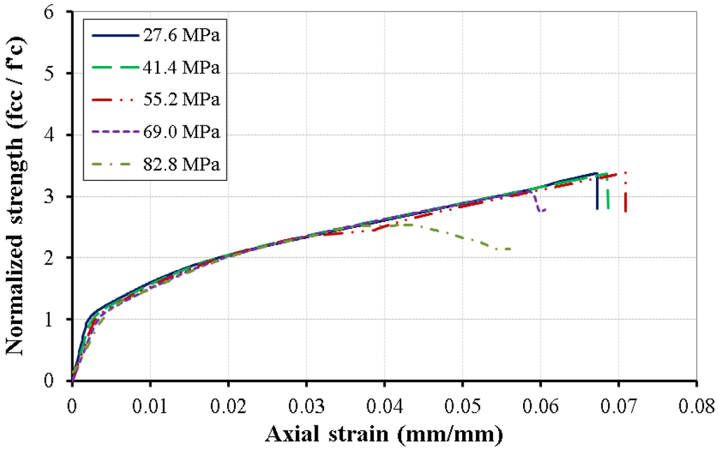 Five columns were studied with different concrete unconfined compressive strengths ( ranging from 27.6 MPa to 82.8 MPa. Figure 7 illustrates the axial strain-normalized strength relation of the CFFTs with different . In general, changing the did not affect the normalized strength or the ultimate axial strain because the columns had the same FRP confinement ratios. However, when the concrete core was high-strength ( ≥ 55.2 MPa), the strength and ultimate axial strain were inversely proportional with the . The lateral concrete expansion is dependent on the concrete mechanical properties. Therefore, the lateral expansion of high-strength concrete is significantly higher than that of the normal strength concrete, which reduces the effect of FRP confinement. The ultimate axial strain and the normalized strength decreased by 14.6% and 9.0%, respectively when the of the high-strength concrete increased by 25% (from 55.2 MPa to 69.0 MPa). The ultimate axial strain and the normalized strength decreased by 21.1% and 24.9%, respectively when the of the high-strength concrete increased by 50% (from 55.2 MPa to 82.8 MPa).