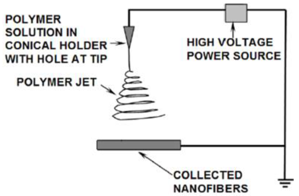 - Reneker, D.H.; Yarin, A.L.; Fong, H.; Koombhongse, S. Bending instability of electrically charged liquid jets of polymer solutions in electrospinning. J. Appl. Phys. 2000, 87, 4531–4547. [Google Scholar]