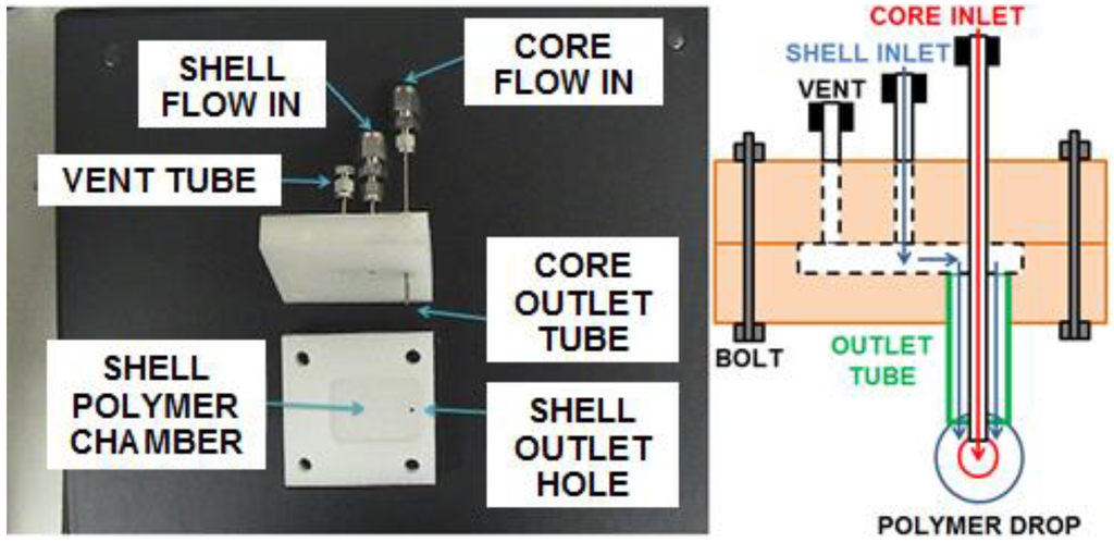 As seen in Figure 2, a custom made device for co-axial electrospinning was designed and fabricated by using two polyvinylidene fluoride plates with stainless steel tubes and compression fittings. The two plates were bolted to prevent leakage.