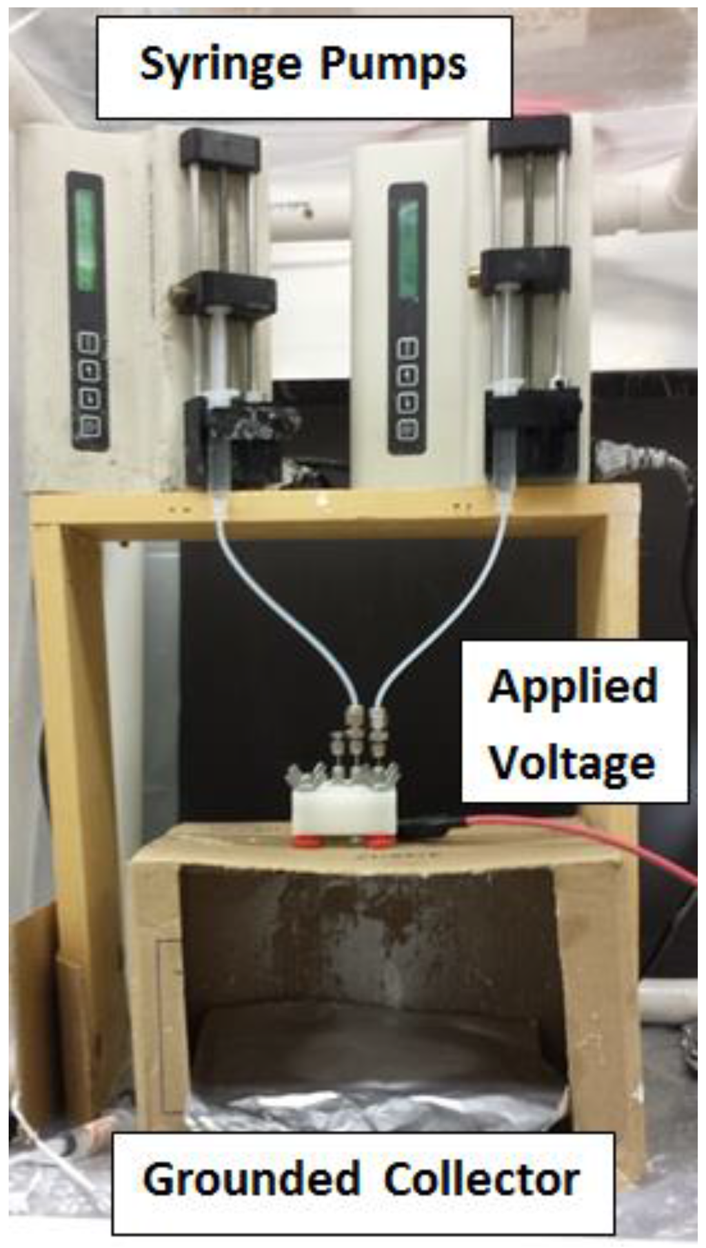 The prepared electrospinning solutions were loaded into 5 cc syringes and delivered to a spinneret via a syringe pumps (World Precision Instruments, SP101i, Sarasota, FL, USA) and Teflon tubes. The polymer solution flow rates to the spinneret were set at 12 µL per minute and adjusted as needed to achieve the desired coaxial jet flow. The spinneret was electrically charged to a potential of 20 kV. The gap distance between the spinneret to the grounded collector was 14 cm. Soon after the spinning is started, a fiber mat was observed on the collector. The thickness of the fiber mat was controlled by the duration of the spinning process.