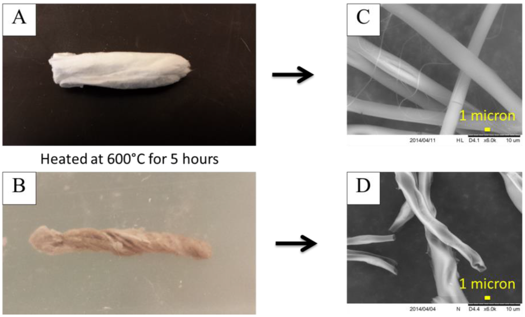 Rolled fiber bundle (A) before and (B) after calcination at 600 °C for 5 h and SEM images (C) before and (D) after to show the change in fiber structure. Image (D) shows the ends of several of the fibers and the hollow cores are visible.