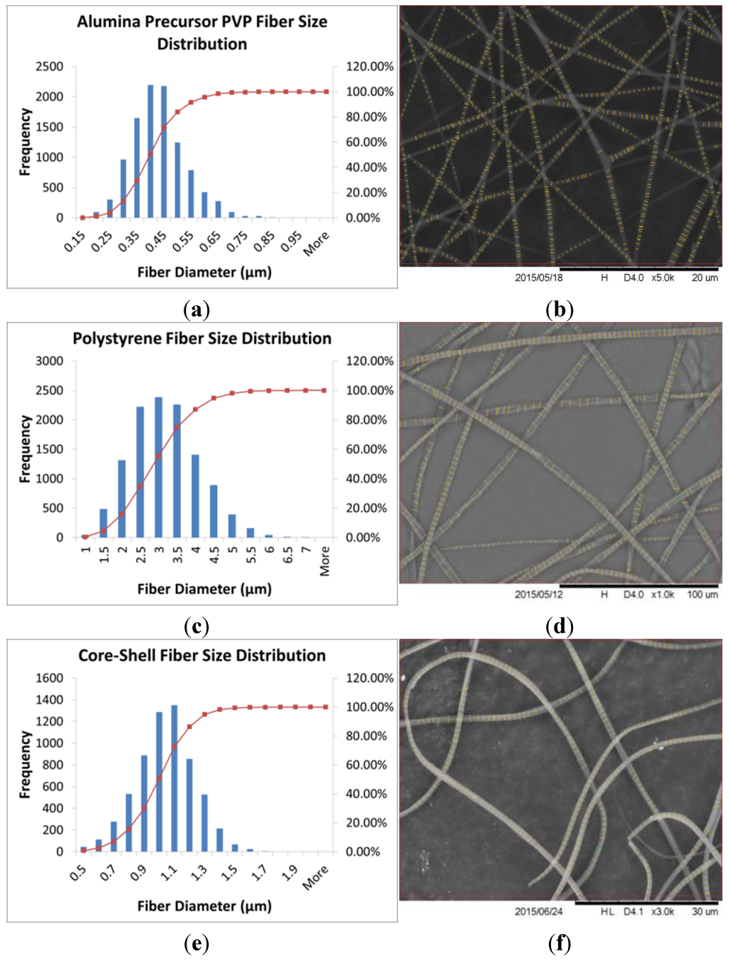Fiber size distribution analysis histograms and sample SEM images after FibraQuant™ analysis for (a,b) alumina precursor PVP; (c,d) polystyrene; and (e,f) core–shell electrospun fibers. The FibraQuant™ software inserted the fine lines at the measurement points onto the fibers in the images in (b,d,f). The fiber size distributions in (a,c,e) were measured from at least five separate SEM images of fibers with over 500 collective measurement points for each fiber material.
