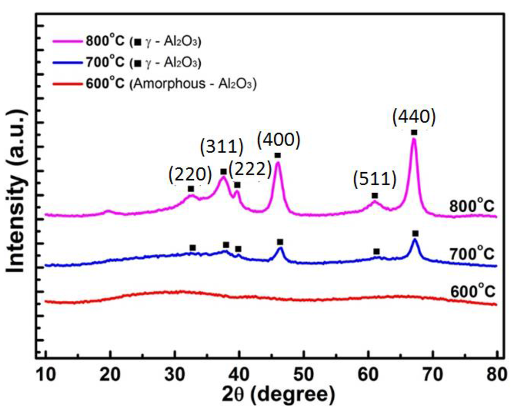 During the calcination process, phase transformation started from amorphous to gamma phase, and the crystallinity of the samples was also increased from 13.2% (700 °C) to 40.6% (800 °C). The estimated γ-Al2O3 crystallite size was 8 nm.