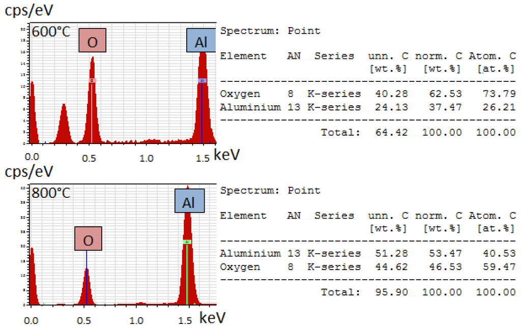 EDS analysis of aluminum oxide fibers calcined at (top) 600 °C and (bottom) 800 °C.