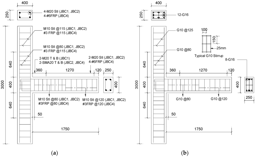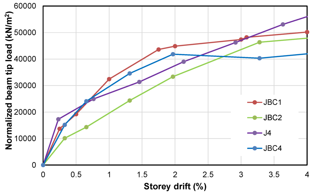 Beam tip load in JBC specimens consists of a load-controlled phase followed by a displacement-controlled loading phase. Displacement-controlled loading is applied after yielding of longitudinal rebars. Different loading approach is selected for GFRP specimen (J4). Since, GFRP does not undergo explicit yielding, a displacement-controlled phase, similar to Fukuyama et al. [] is applied with incremental drift. More details of loading are provided in Said and Nehdi [] and Nehdi et al. [].