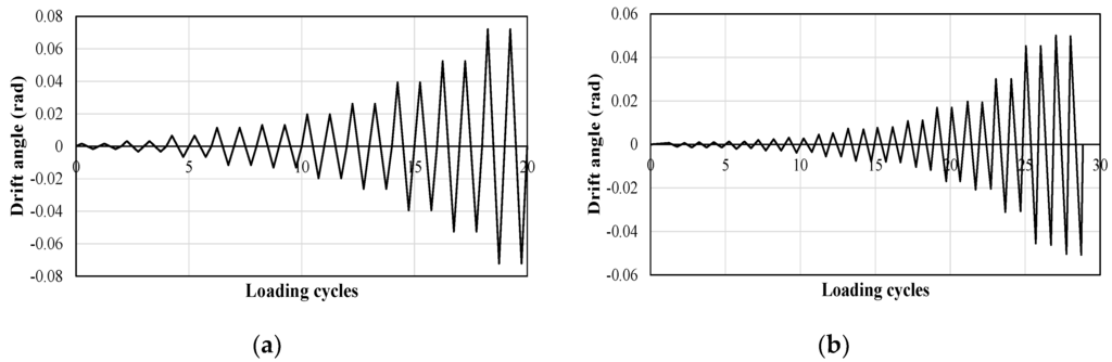 Experimental setup, load and displacement measuring techniques are well explained in the work of Nehdi et al. [], Alam et al. [] and Said and Nehdi []. Schematic illustrations of test setup and instrumentation of test specimens can be found in the original research. Load history for the reverse cyclic loadings are shown in Figure 2.