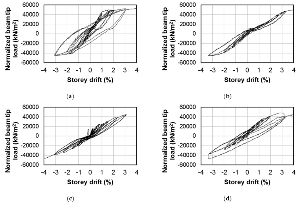 Beam tip load–storey drift relationship of specimen (a) JBC1 (b) JBC2 (c) J4 (d) JBC4.
