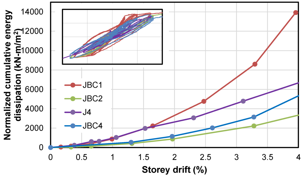 The energy dissipated in a cycle is calculated as the area that the hysteretic loop encloses in the corresponding beam tip load-displacement plot. Figure 5 shows plots of the cumulative energy dissipation versus story drift for the tested specimens JBC1, JBC2, J4 and JBC4. JBC1 and J4 dissipated 6865 kN-m/m2 and 4756 kN-m/m2 of normalized energy respectively at a story drift of 3%, whereas JBC2 and JBC4 dissipated 2000 kN-m/m2 and 2300 kN-m/m2 of normalized energy respectively. Though GFRP BCJ starts with similar energy dissipation capacity like steel BCJ as shown in Figure 5, it is proved that steel RC specimen dissipates significantly higher energy than FRP RC members at higher drift ratio. At a story drift of 4%, JBC4 dissipated 5300 kN-m/m2 of energy, JBC2 dissipated 3140 kN-m/m2 while JBC1 dissipated 13,930 kN-m/m2 of energy, around twofold higher than that of JBC4. At higher story drift (4%), GFRP-RC and SMA/FRP specimens displayed comparable results. JBC4 started to show gradual increase in slope at higher drift ratio, which is the scenario of devastating earthquake event. Though the steel RC BCJ dissipated energy through larger hysteric loops, SMA/FRP and SMA/Steel RC joint helped in dissipating comparable extent of energy by slippage of bars inside the concrete. Regular steel specimen has the higher ultimate energy dissipation capacity. Higher plastic deformation in steel and SMA/Steel rebar occurred in the beam, thus increased the area under each loop to enable higher energy dissipation. On the contrary, lower stiffness and inaptitude to sustain plastic deformation may cause lower energy dissipation of GFRP-RC specimen and sudden failure.