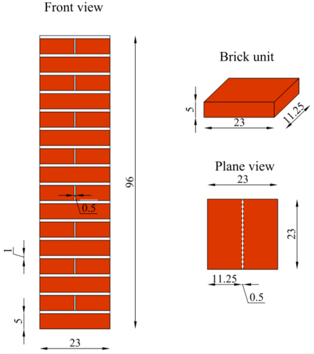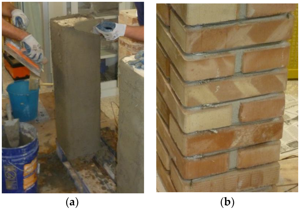 Columns were made up by assembling two brick units for the course, arranged orthogonally to the units in the upper and lower courses, and connected with mortar joints with a thickness of 10 mm. Specimens were reinforced after manufacturing and after a curing time of about two weeks.