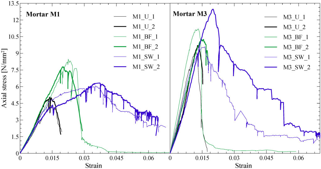 In more detail, regarding series M1, the mean values of maximum stress, ultimate strain and absorbed energy increased respectively by 74%, 54% and 167% for BF specimens and by 33%, 154% and 312% for SW specimens. Similarly, for series M3 columns, they increased respectively by 14%, 15% and 45% for BF specimens and by 18%, 48% and 94% for SW specimens.
