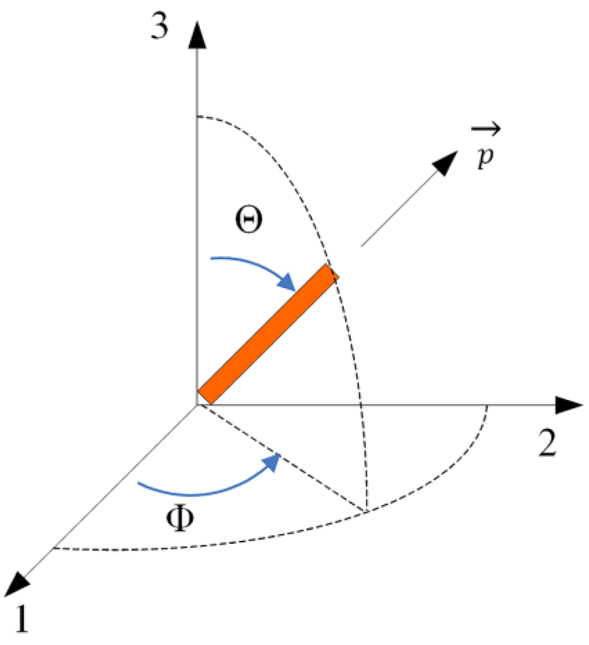 Representation of the solid angle of fiber orientation with respect to axis name according to Advani and Tucker; 1 to denote flow direction x, 2 to denote in-plane transverse to flow direction y and 3 to denote thickness direction z [8].