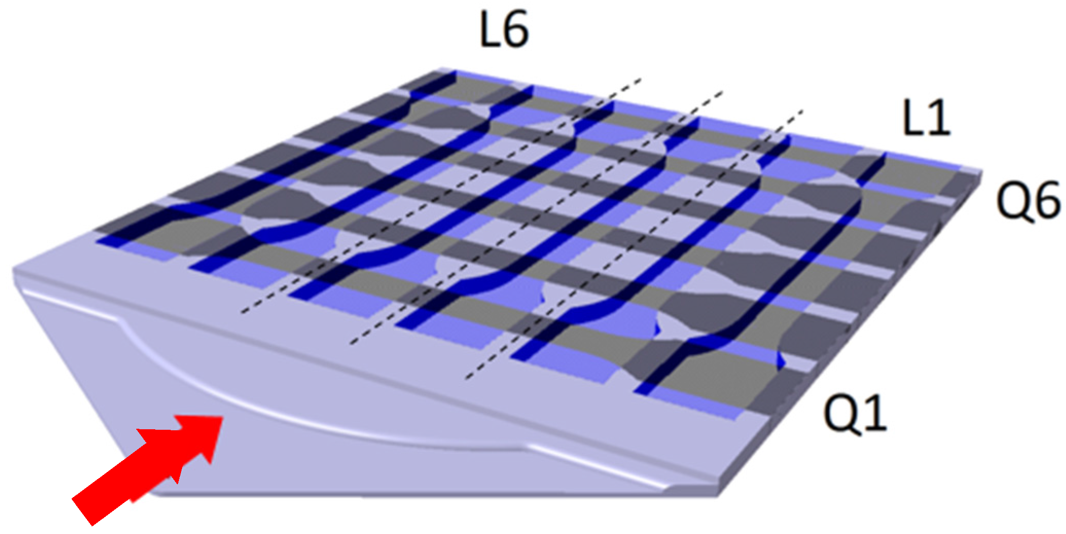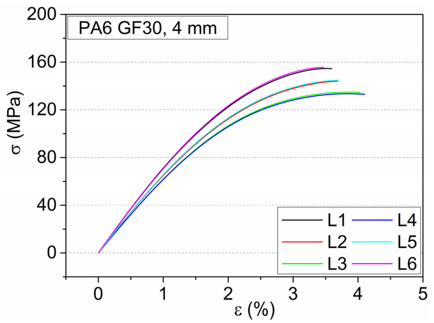 The position-dependent glass fiber orientation influences mechanical properties like the tensile strength σM or the modulus of elasticity Et. In Figure 4 the stress–strain curves are shown for six positions (L1 to L6) of the injection molded plate for the material PA6 GF30 with 4 mm thickness. The symmetry of the mold filling due to the film gate can be seen in similar stress–strain curves of position L1 and L6, position L2 and L5 and position L3 and L4 (see Figure 2). By the filling, there are differences in the glass fiber orientation tensor within the molded plate, which cause a difference in the tensile strength of the longitudinally oriented specimens of around 23 MPa, corresponding to a relative difference of 9% of the mean value of axx. Furthermore, it is apparent that the elongation at break εtB of positions L3 and L4 from the center of the plate is more pronounced than the values from position L1, L2 or L5, L6.