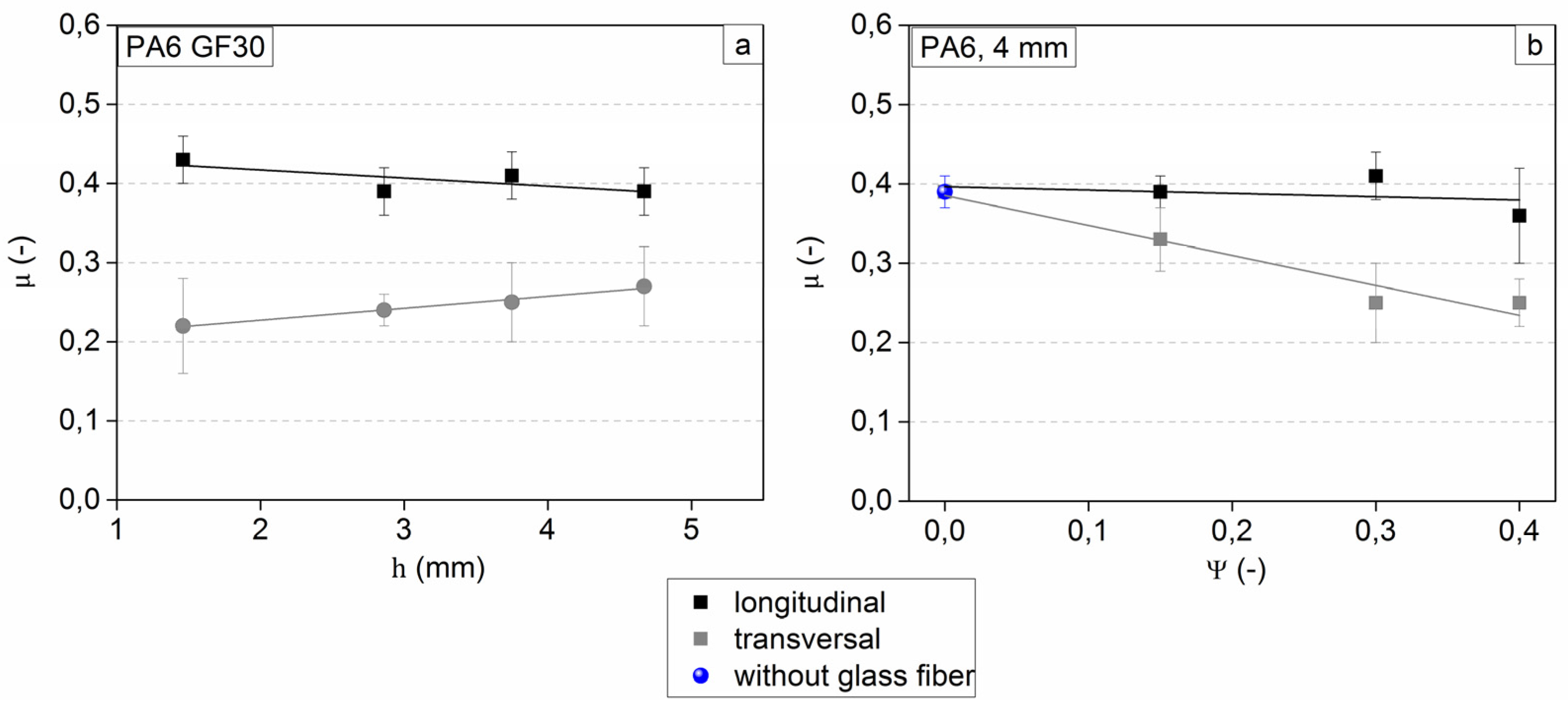 The influence of glass fiber orientation as well as glass fiber content was mentioned by Kunz [11] and Saechtling [12]. In Figure 5, the Poisson’s ratio for PA6 GF30 is shown depending on glass fiber orientation for different specimen thicknesses (Figure 5a), as well as glass fiber orientation for different glass fiber contents (Figure 5b). Furthermore, the linear fit curves for longitudinal and transverse orientation are implemented.
