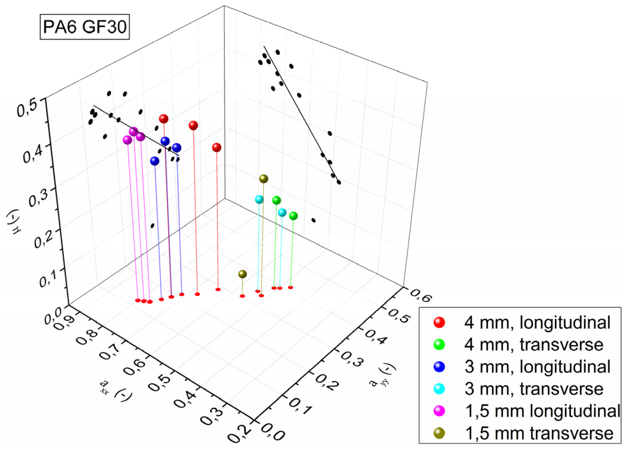 Due to the tendency of the Poisson’s-ratio behavior in the longitudinal and transverse orientation shown in Figure 5, the Poisson’s ratio as a function of the orientation tensor components axx and ayy, analyzed by MicroCT, is shown in Figure 6. The values of the PA6 test specimen with 4 mm thickness and 30 wt% of glass fiber of the longitudinally oriented positions L1, L2 and L3 as well as the transversely oriented positions Q1 and Q3 were used. The same kinds of data sets were obtained for 1.5-mm and 3-mm thickness and are used in this diagram. In general, it could be observed that with increasing glass fiber orientation in the flow direction the Poisson’s ratio increases, and that the range of values for Poisson’s ratio μ depends on the orientation and lies in the range of 0.22 to 0.45. A linear tendency of the dependency of Poisson’s ratio on the glass fiber orientation is recognizable.